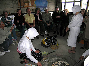 現役海女らが運営する鳥羽市相差町の海女小屋「はちまんかまど」で22日、米国のツアー客を招いた体験イベントが開かれた。